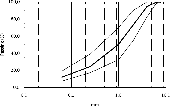 Sand sieve analyses (Fig. 1) show that the all grains pass through the 8 mm sieve with Dmax between 4 and 8 mm, and exhibit a fairly wide range of values in between the 8 mm and 63 µm sieves. Sand fines content is between 7 and 20%. The crushed limestone sands examined are devoid of organic substances such as humus and fulvic acid, moreover, their lightweight contaminants and water soluble components are negligible. The quality of fines (MB, SE), angularity (Ecs), durability (MS), and water absorption (WA24) behavior is presented in Table 5 and is deemed more than satisfactory. Mean apparent dry density values for sand as well as for fine and coarse gravel confirm the mineralogy data as they are much closer to that of pure calcite (CaCO3) 2,71 g/cm3 and much less to that of dolomite (CaMg(CO3)2) 2,85 g/cm3 or any of the other carbonate minerals, i.e., siderite (FeCO3) 3,87 g/cm3, magnesite (MgCO3) 3,0 g/cm3, ankerite (CaFe(CO3)2) 3,2 g/cm3.