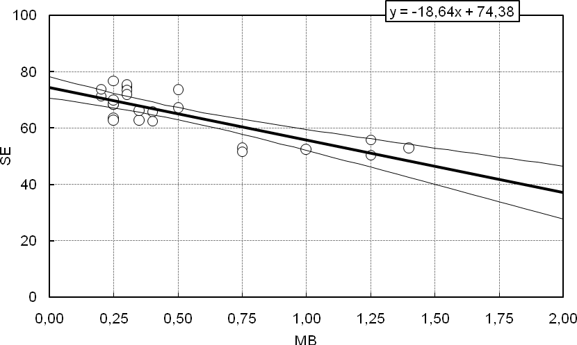 Meaningful correlations among physical and mechanical properties of sand arise in a few cases (Table 6). There is a positive correlation between MB and Ecs values that may suggest that clay-size material or clays may inhibit flow of sand grains. The correlation between ρα and Ecs was anticipated since the Ecs calculation is based on density. A close relationship between MB and SE did not materialize in these types of aggregates as they are generally devoid of clay-size or clay materials. However, if we include in the data set MB and SE values from all-in aggregates which are used in road pavement construction then the correlation becomes stronger as the data cover a greater range of values (Fig. 2).