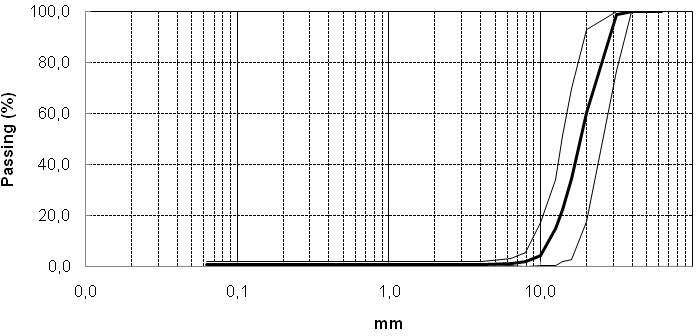 Figure 4. Range (solid lines) and mean (heavy solid line) of coarse gravel sieve analyses.