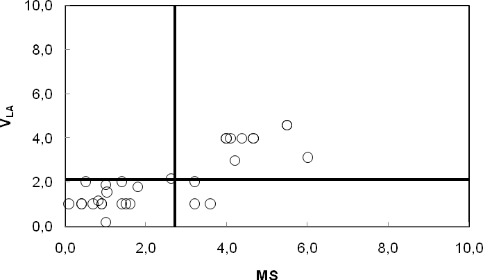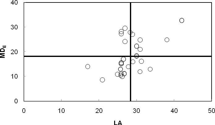For fine and coarse gravel, significant (i.e. correlation coefficient >|0,5|) and common in both aggregate types correlations are observed between the following pairs of tests: MS and VLA, MDE and LA, FI and SI (Table 7 and 9). The correlation between MS and VLA is surprising and needs further investigation as we have not seen it in the literature. Nonetheless, the strong relationships between these three pairs of tests suggest that it may be advantageous to use them as discriminating constraints of aggregate quality (Fig. 5, 6,